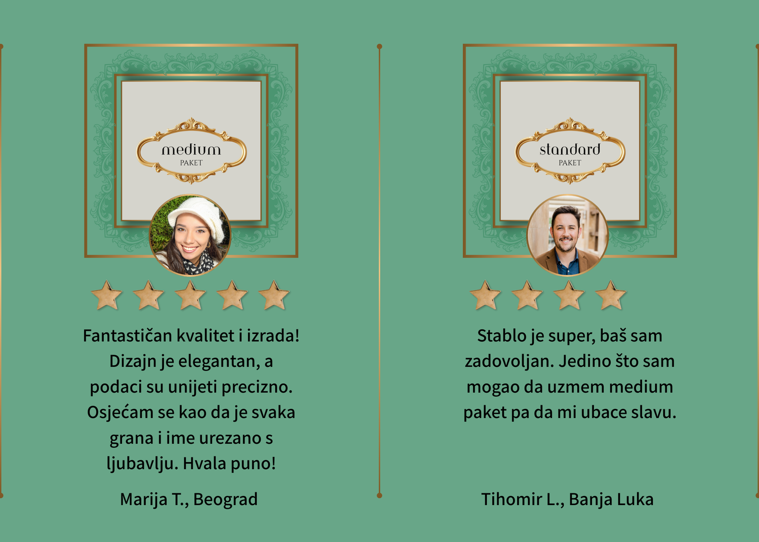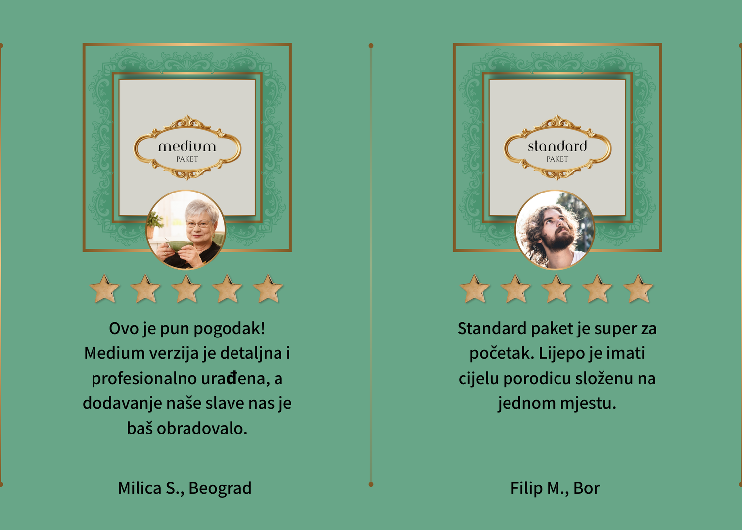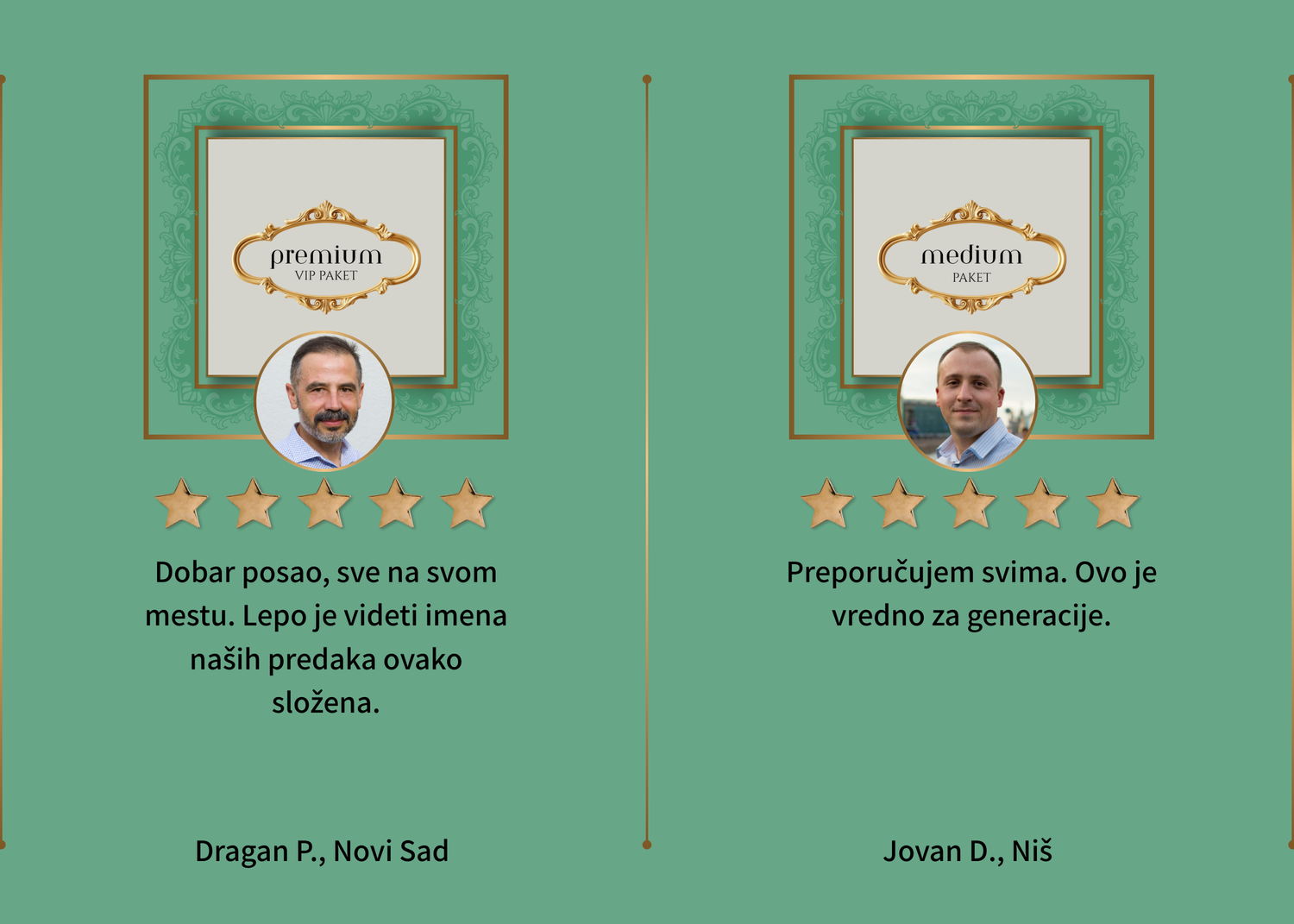 Bez obzira koji paket izaberete, svako porodično stablo se radi sa istim nivoom poštovanja prema vašoj lozi, vašem prezimenu i vašoj priči.