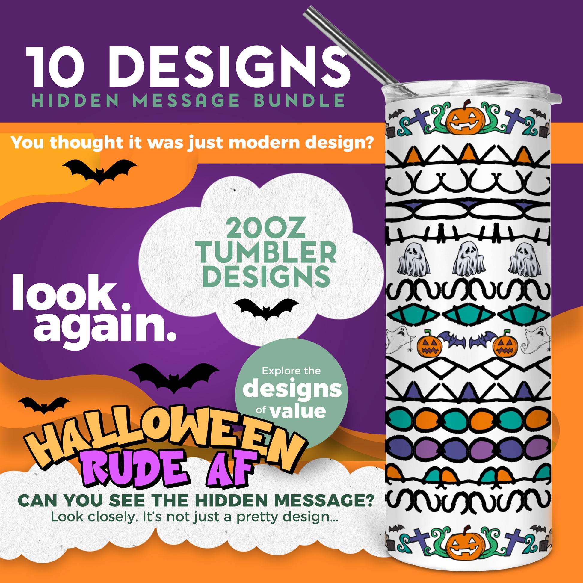 10 Designs Halloween Bundle Hidden Message Geometric 20 oz Tumbler | Hidden Message Halloween PNG Halloween SVG for Sublimation & Cricut