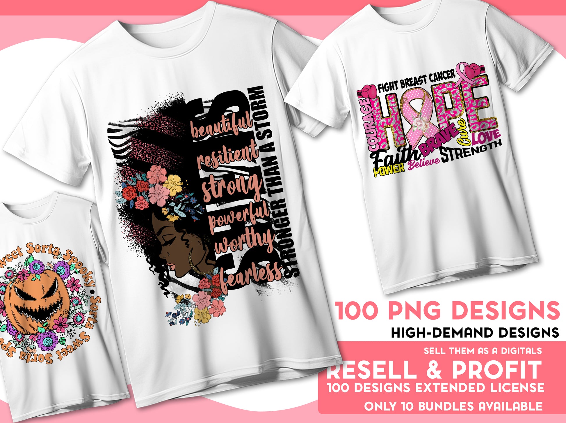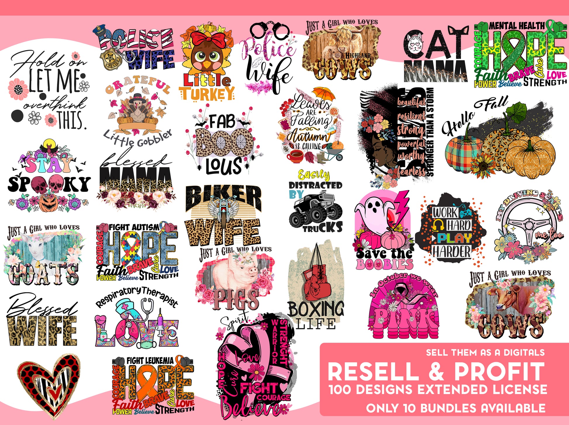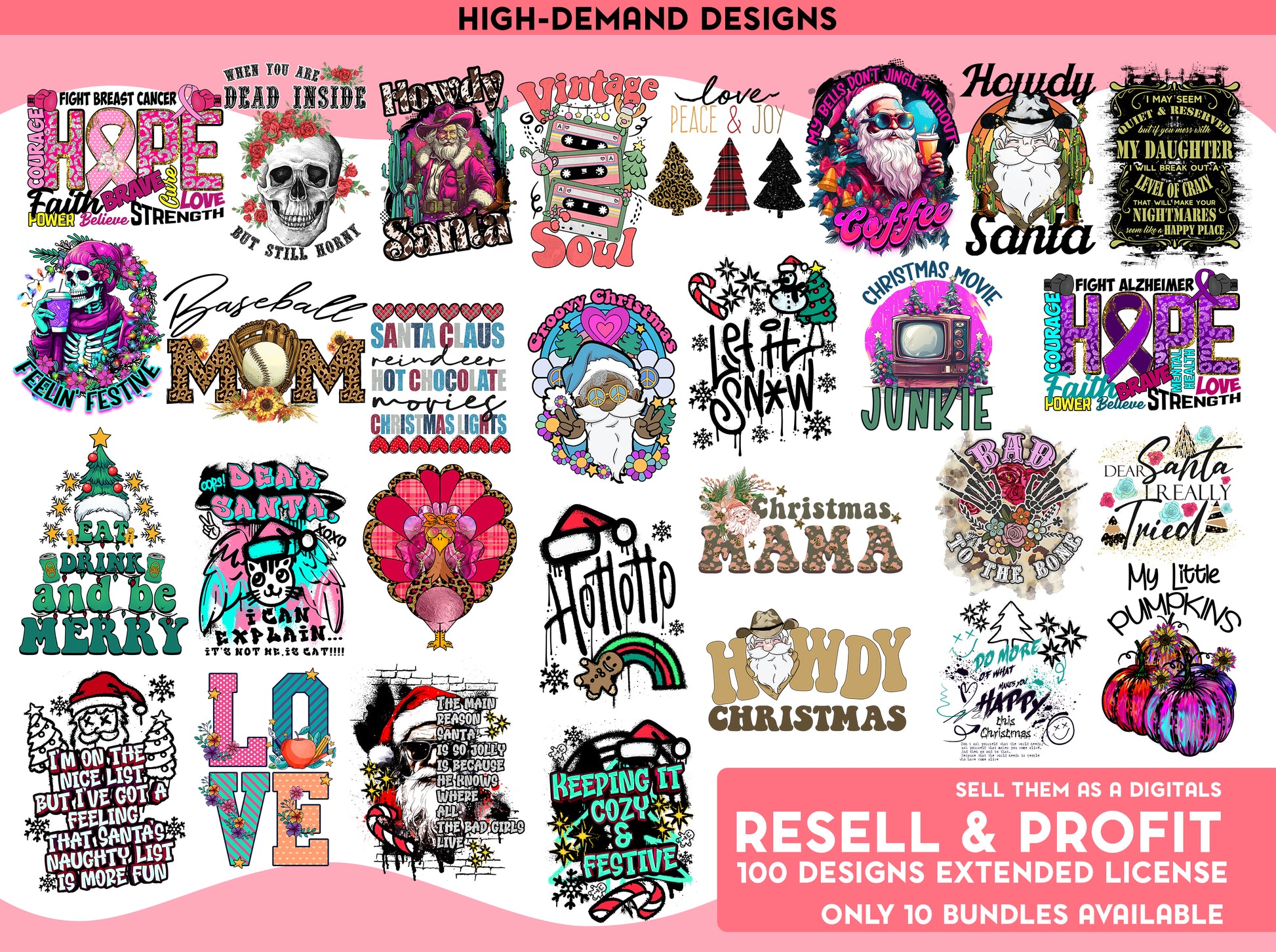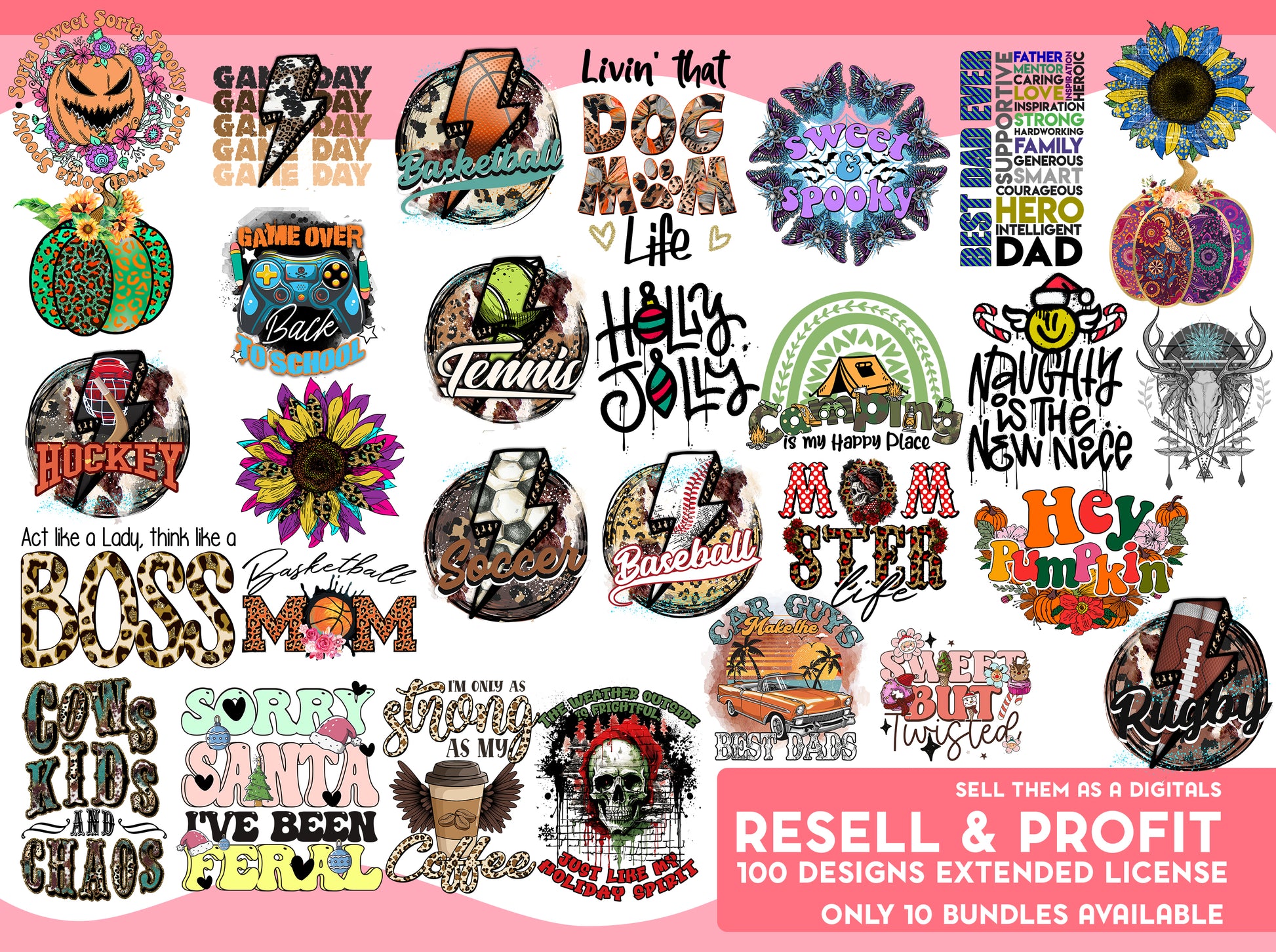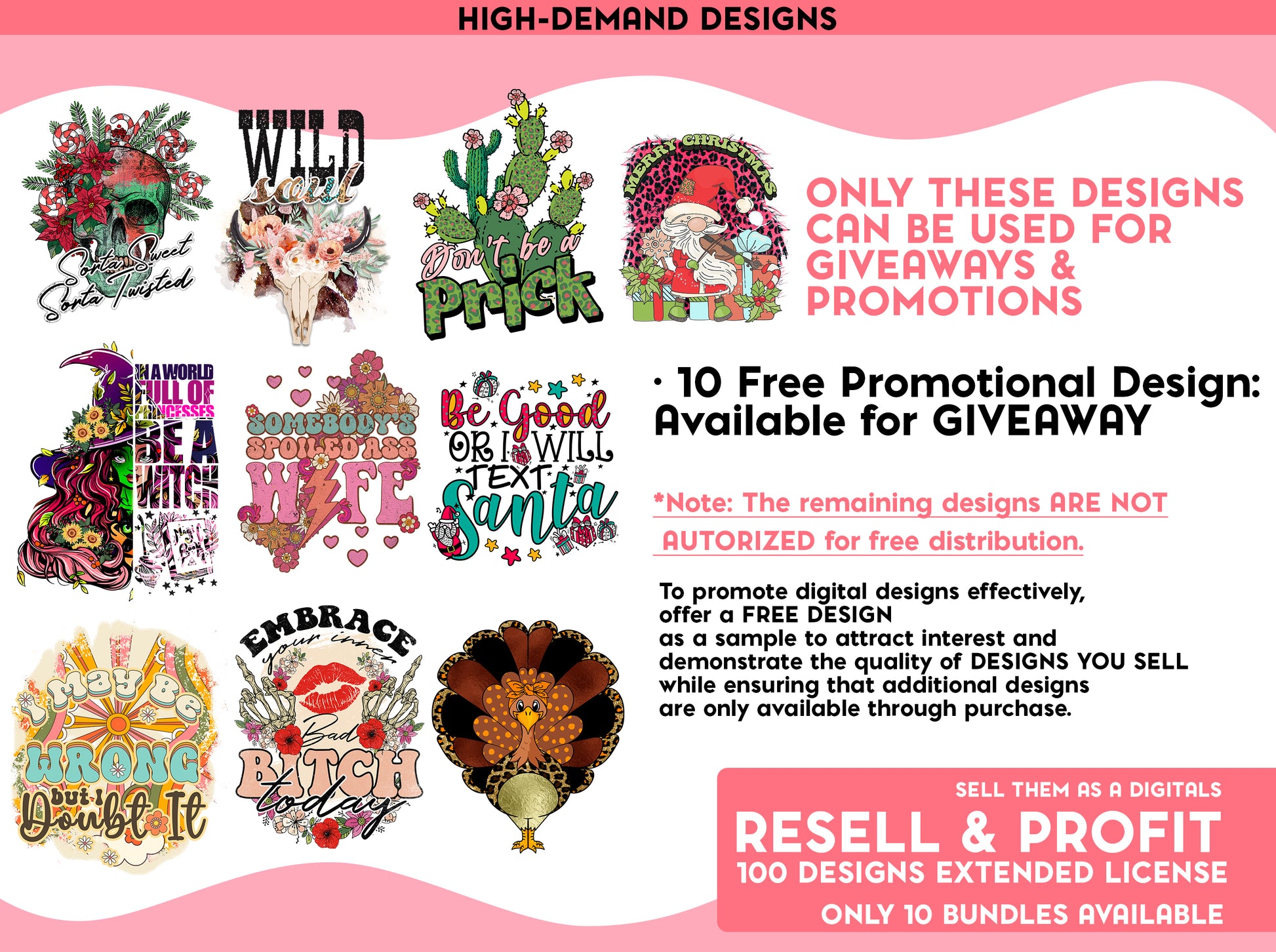 The bundle includes 100 exclusive, high-resolution PNG designs that come with a commercial license for resell as a DIGITAL FILES. Each design is crafted with professional quality and attention to detail. + 10 Png Design that you can use for GIVEAWAYS and PROMOTIONS (*Note: The remaining designs are not authorized for free distribution.)