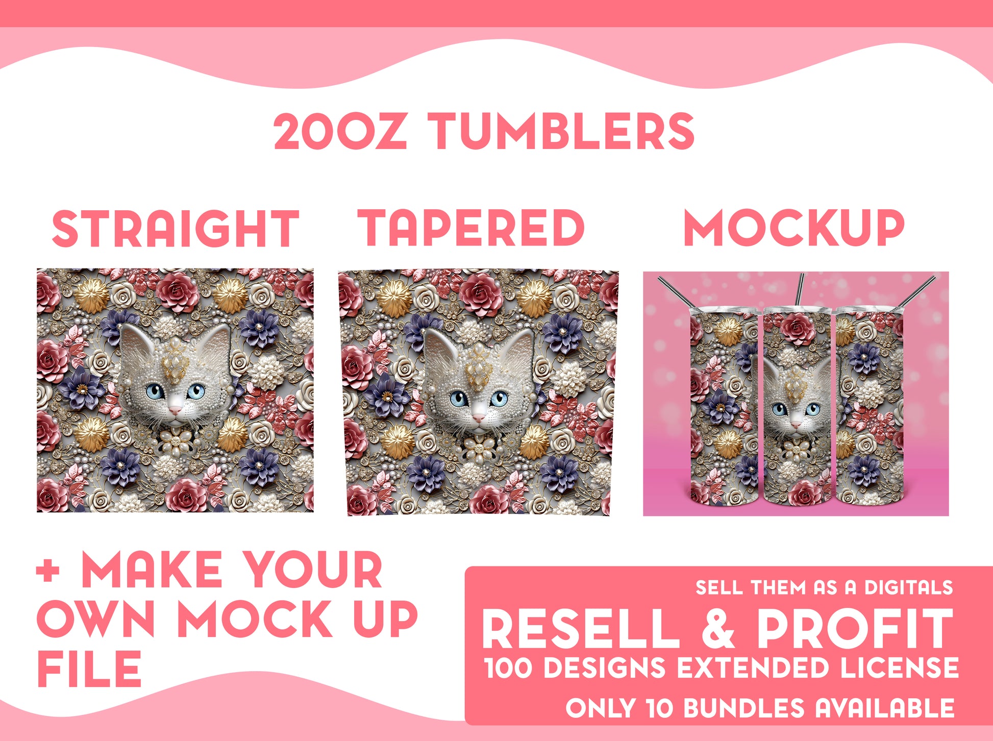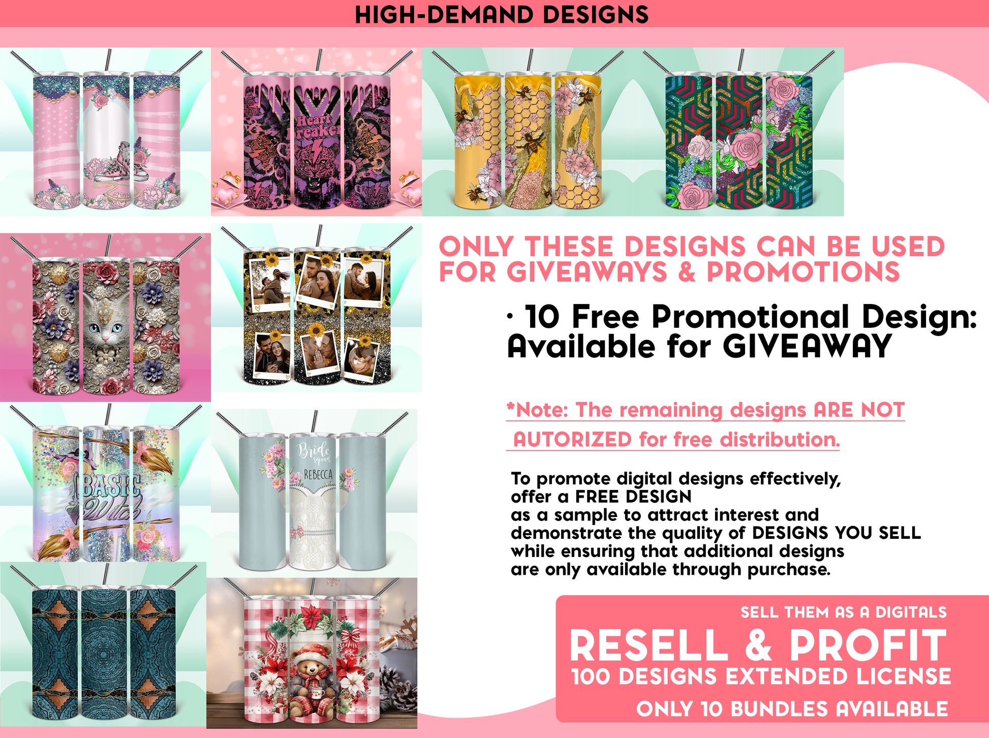 The bundle includes 100 exclusive, high-resolution TUMBLER PNG designs that come with a commercial license for resell as a DIGITAL FILES. Each design is crafted with professional quality and attention to detail. + 10 Png Design that you can use for GIVEAWAYS and PROMOTIONS (*Note: The remaining designs are not authorized for free distribution.) For each Design you will get Png Design for STRAIGHT 20oz Tumbler, TAPERED 20oz + Mockup