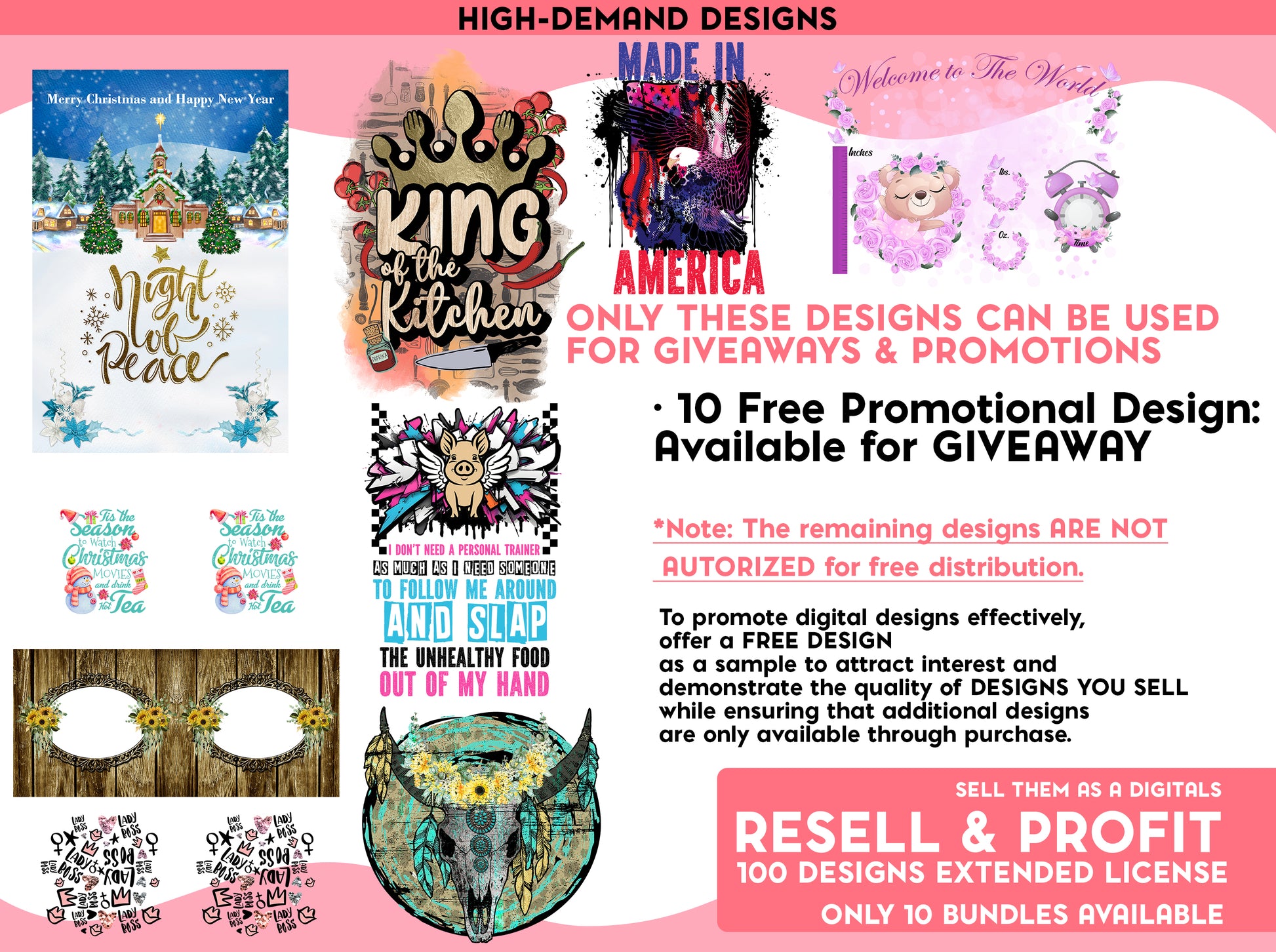 The bundle includes 100 exclusive, high-resolution PNG designs that come with a commercial license for resell as a DIGITAL FILES. Each design is crafted with professional quality and attention to detail. + 10 Png Design that you can use for GIVEAWAYS and PROMOTIONS (*Note: The remaining designs are not authorized for free distribution.)