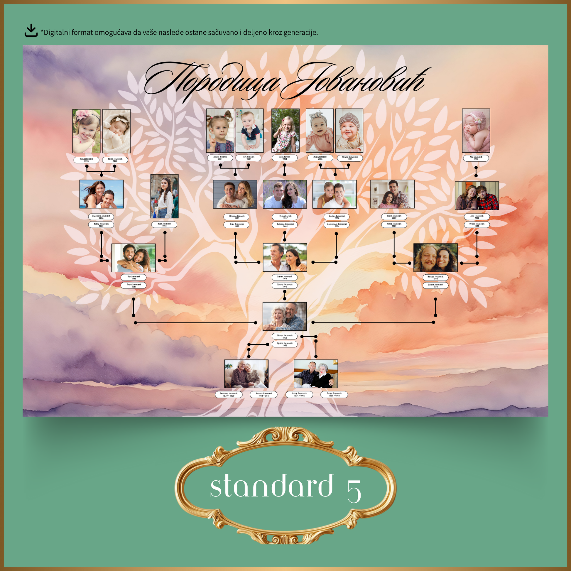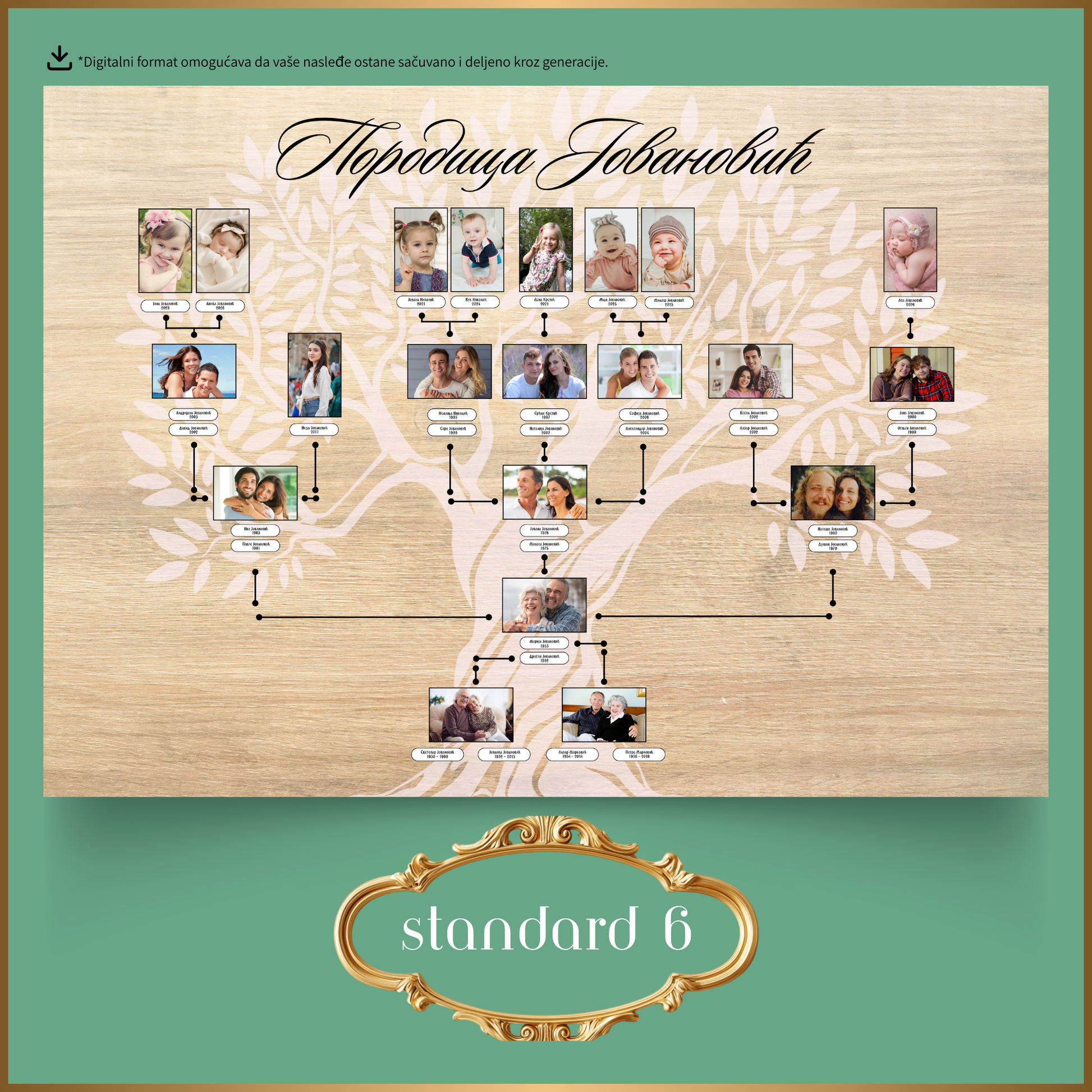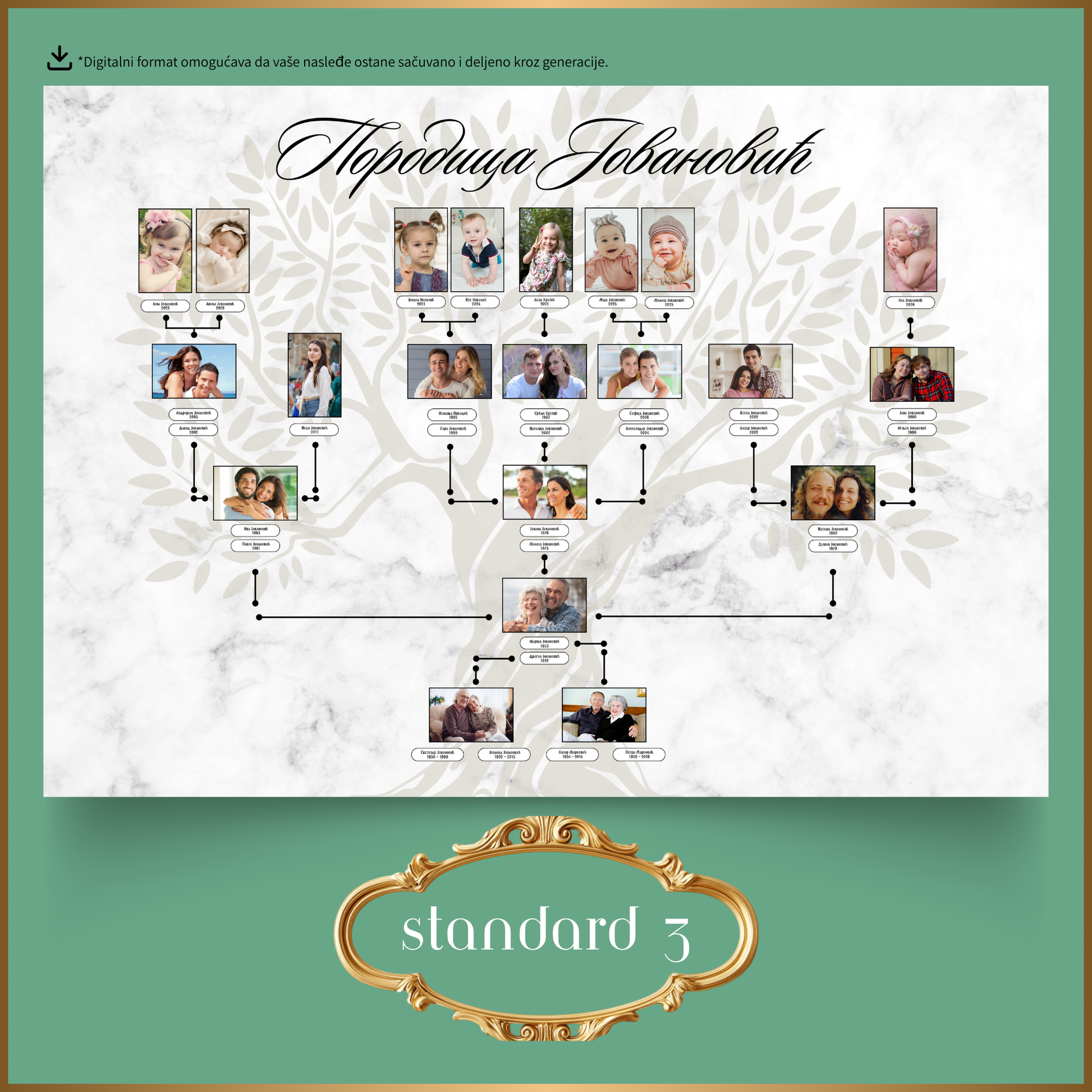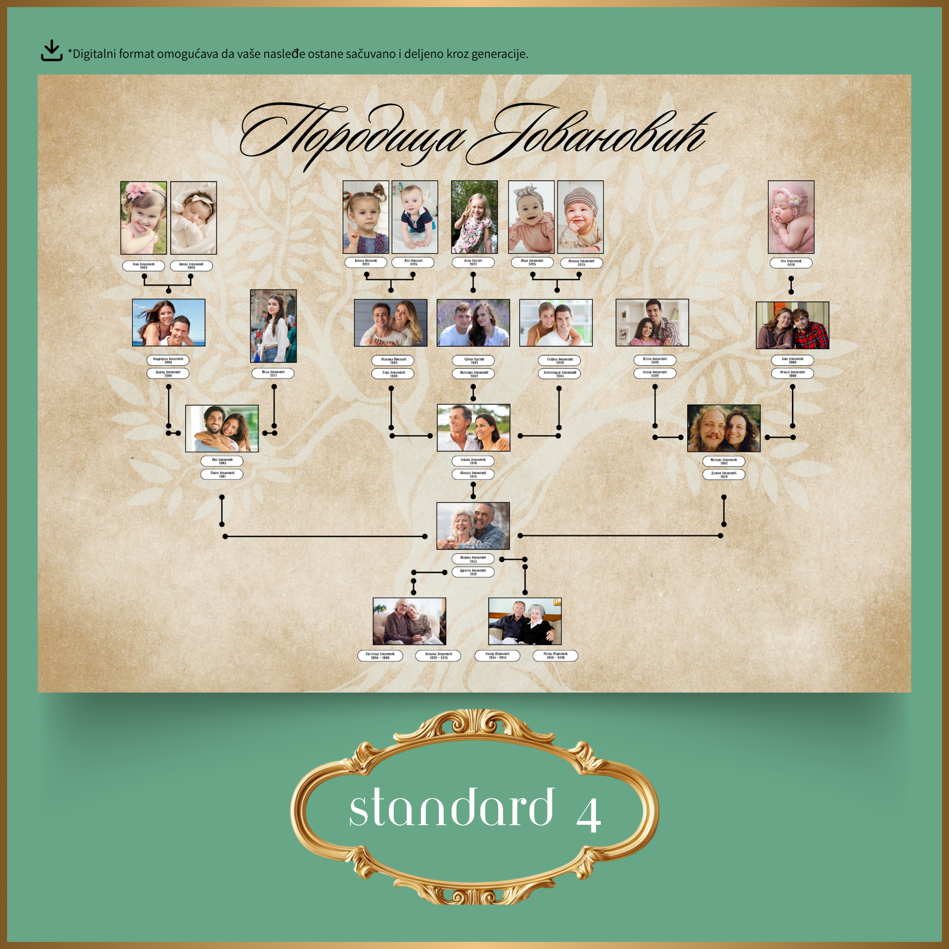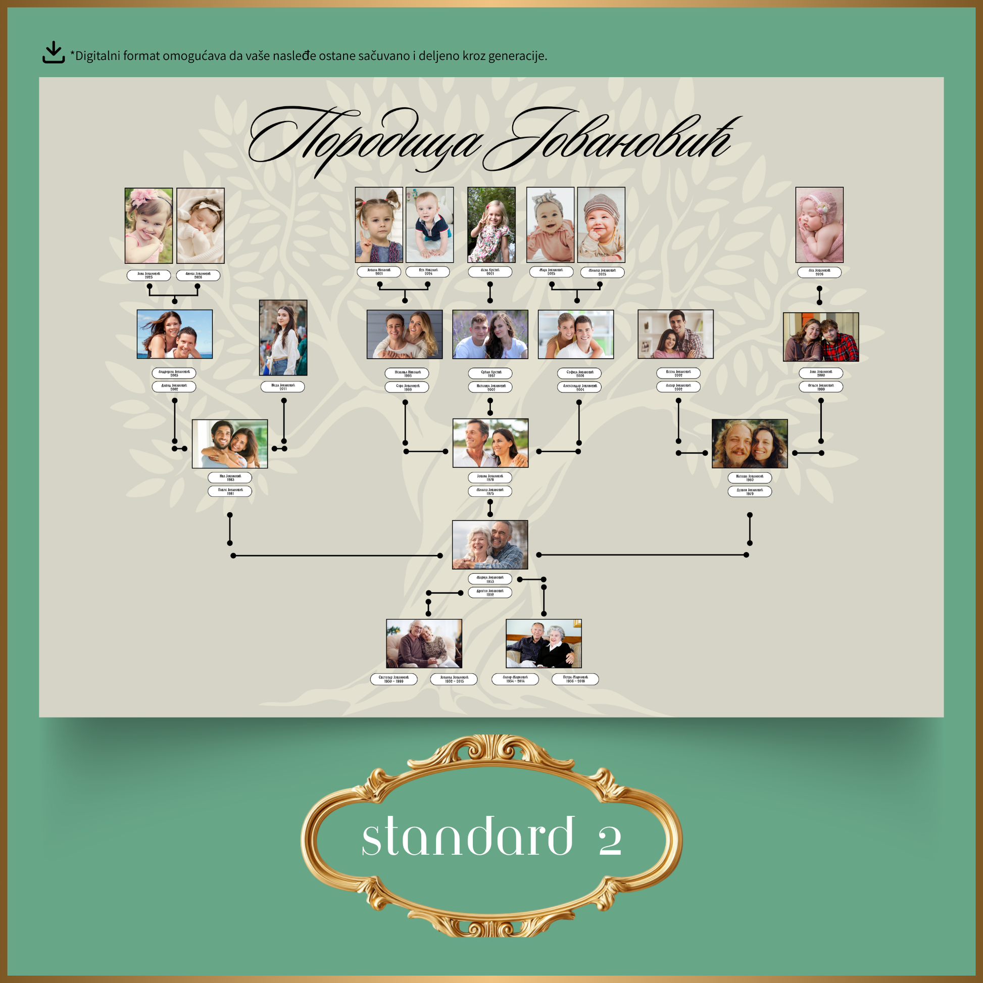 STANDARD paket je idealan za porodice koje žele svoje porodično stablo profesionalno i elegantno prikazano – i personalizovano tačno onako kako su ga oduvijek zamišljali.